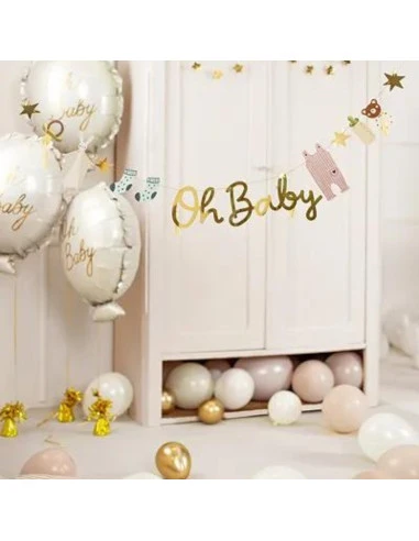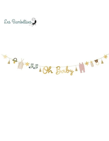 Cette Guirlande « Oh Baby » mesure 2,5 m. Elle contient 13 étiquettes en papier: hochet ourson, body bébé rose, chaussettes bleues, biberon, tétine, étoiles et une belle écriture « Oh Baby » dorée.