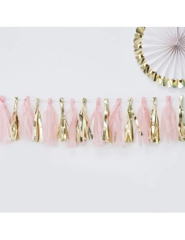 Pour la décoration de votre fête baby shower, baptême, anniversaire , cette guirlande tassel rose pastel et doré brillant.